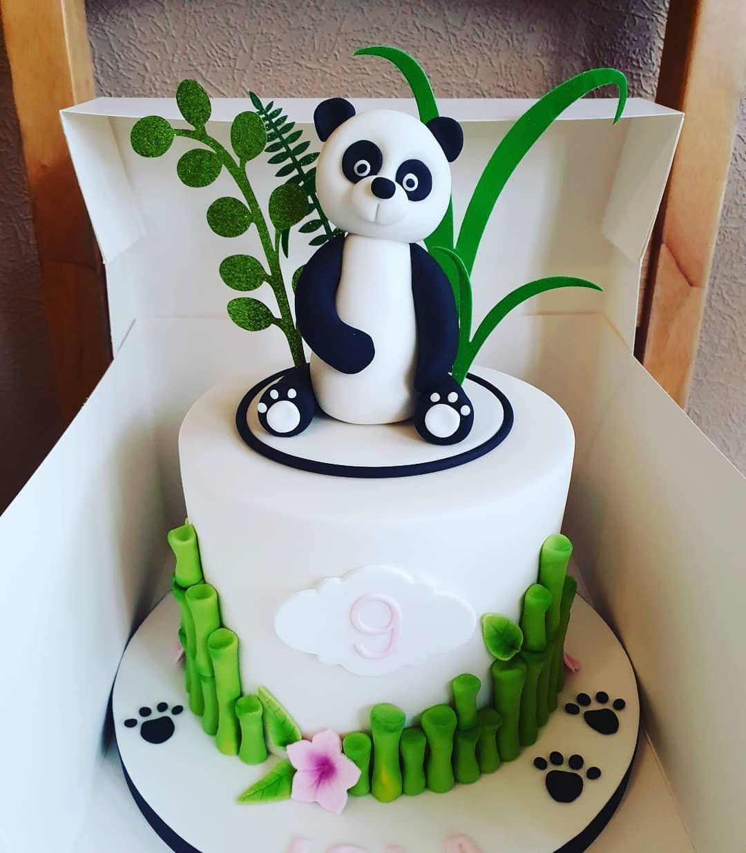 The lower tier is decorated with bright green bamboo stalks, delicate pink flowers, and tiny paw prints for playful detailing. Centered with a soft cloud plaque featuring the number “9,” the cake combines elegance and creativity into a beautifully balanced design.