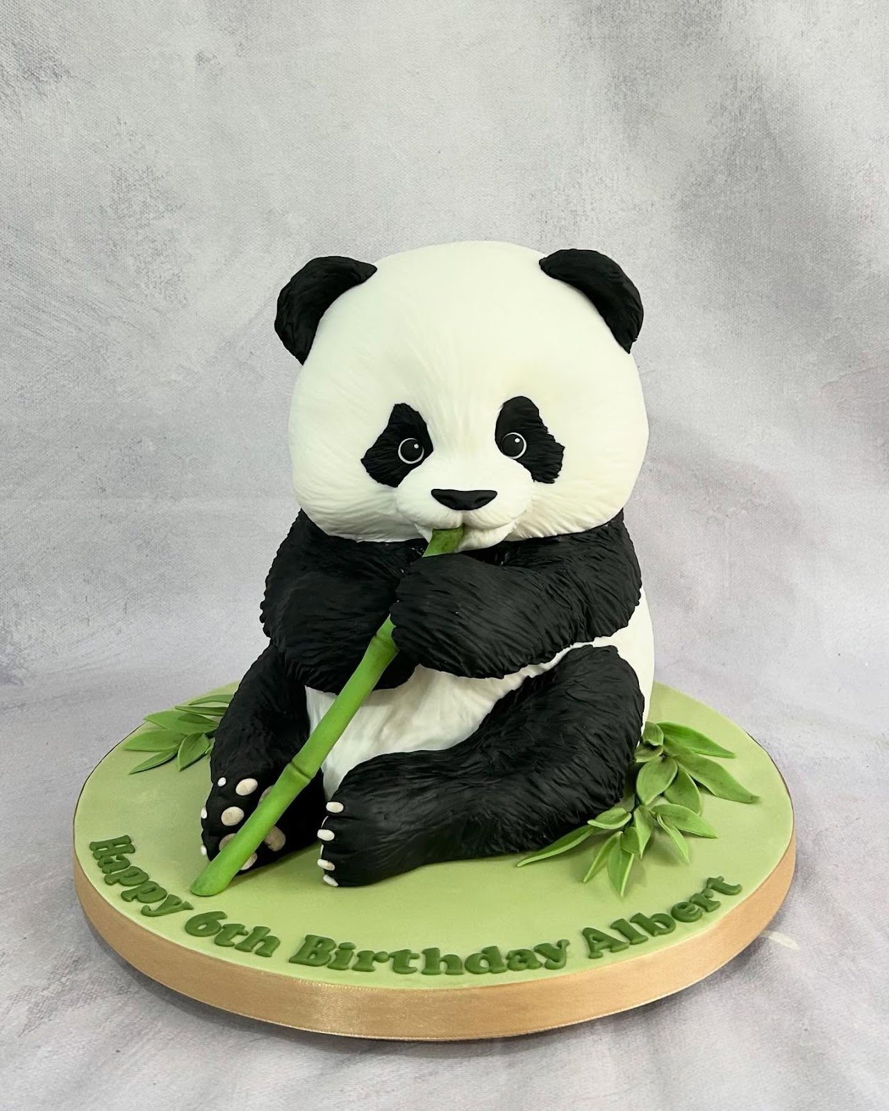 A lifelike panda sculpted from cake captures attention with its textured fur and expressive eyes. Seated naturally, the panda holds a green bamboo stalk, giving the design an authentic and heartwarming charm. Leaves around the base complete the natural scene.