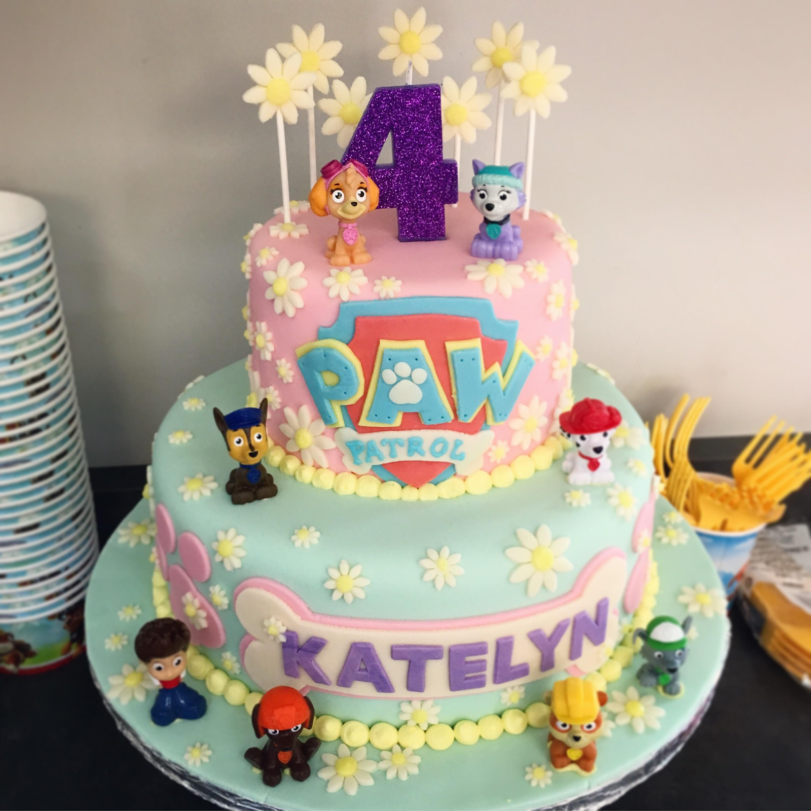 Bursting with color and joy, this two-tier Paw Patrol cake instantly captures attention with its playful details. Soft pastel shades of pink and mint green set a delightful backdrop, while cheerful daisies decorate every layer, creating a fresh and vibrant look. The sparkling purple number “4” topper adds a touch of magic, making the cake shine as the centerpiece of the celebration.
