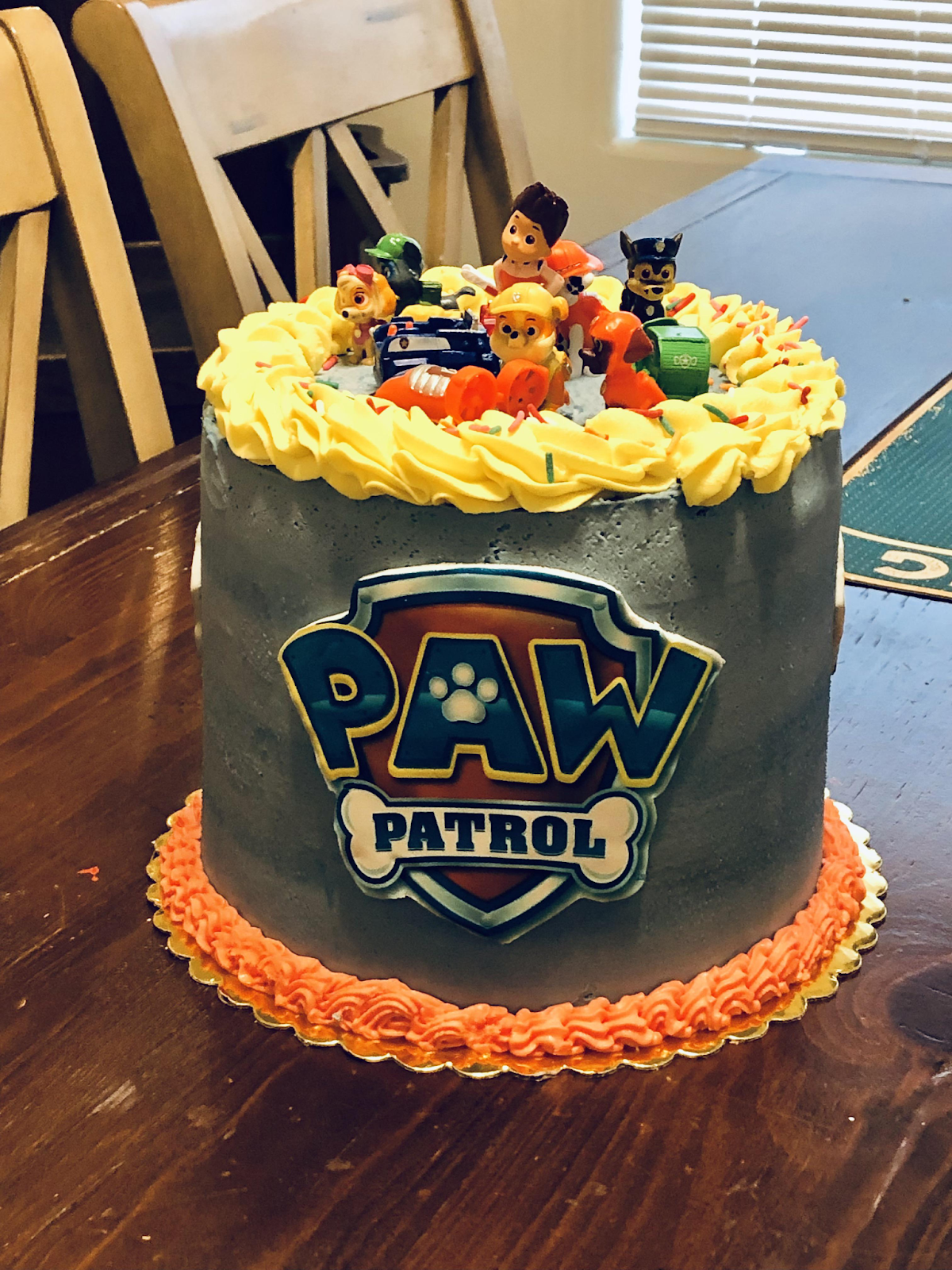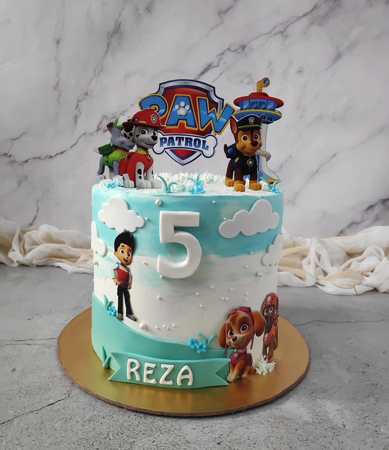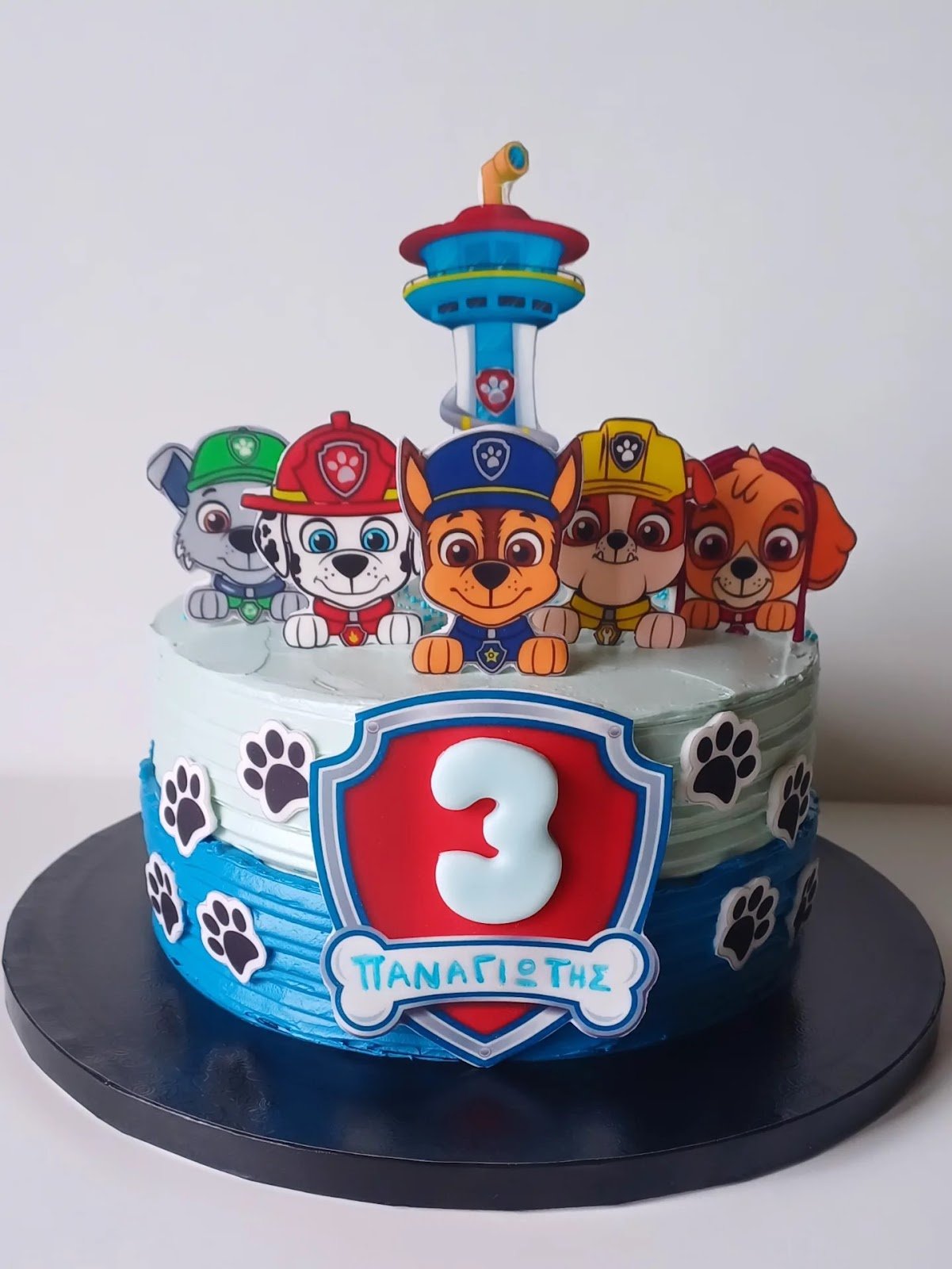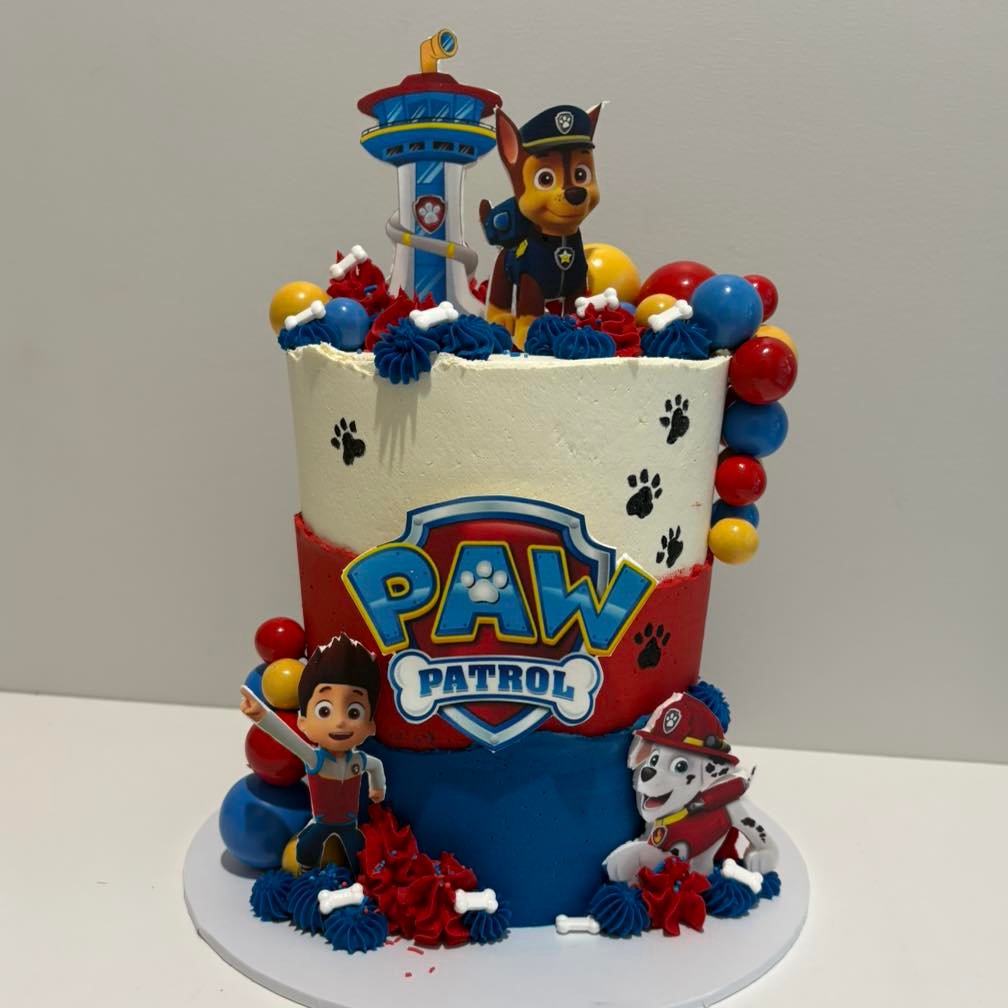 The bold “Paw Patrol” logo at the center, surrounded by adorable character toppers and delicate buttercream swirls, enhances the cheerful theme. Bright colors and creative details make this cake an ideal treat for any young fan of the series.
