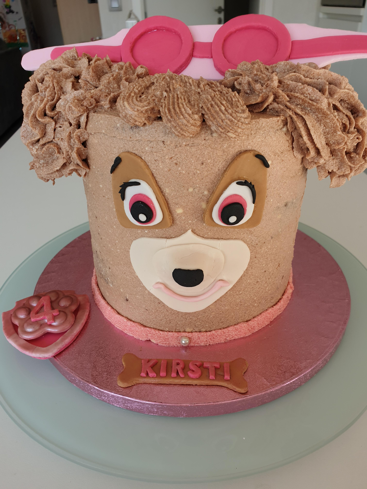 The base is decorated with a shimmering pink board, featuring a paw badge with the number 4 and a bone-shaped plaque personalized with the name “Kirsti.” Every detail, from the piped textures to the playful accessories, captures the fun-loving spirit of Paw Patrol. Perfect for little fans, this cake makes the party both magical and memorable.
