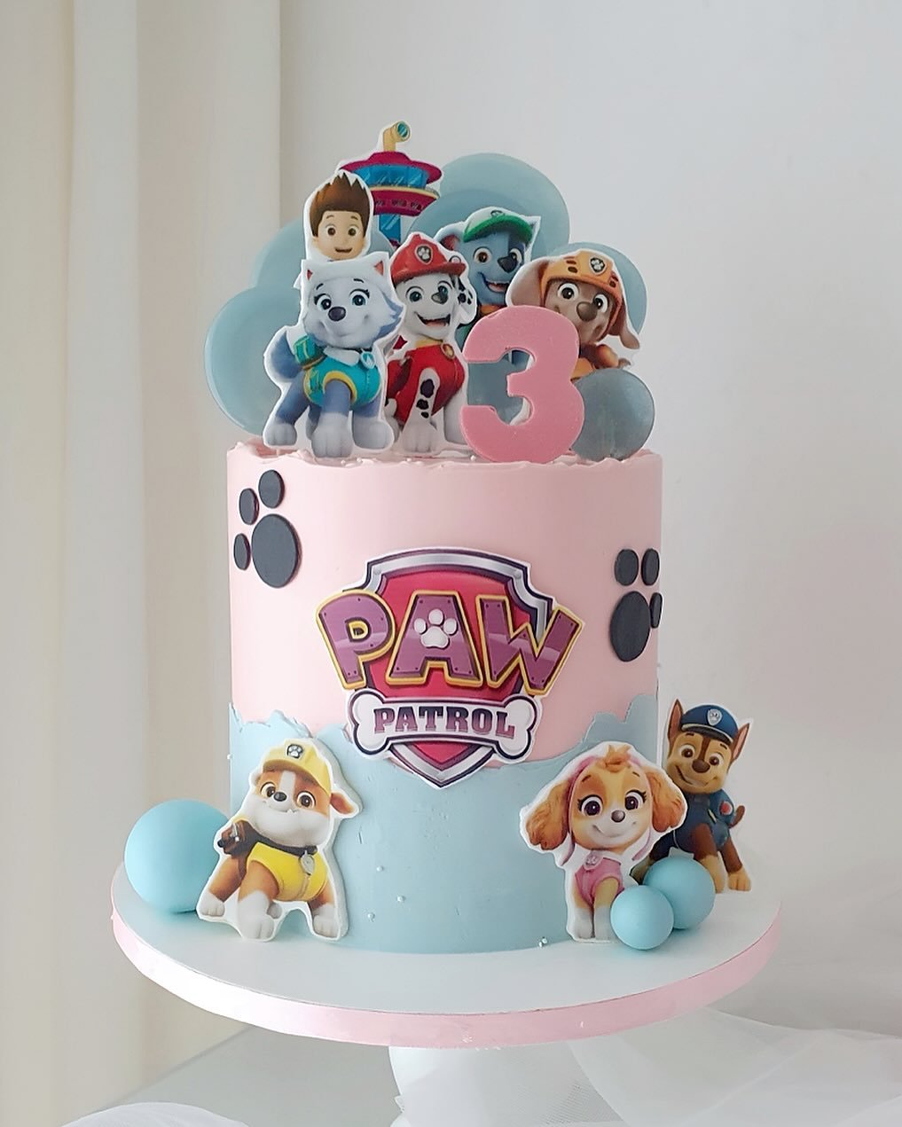 This delightful Paw Patrol-themed birthday cake, with its soft pink and blue frosting, is perfect for a 3rd birthday party. Adorned with colorful Paw Patrol character toppers like Ryder, Skye, Chase, and Marshall, the cake brings the beloved characters to life. The pastel-colored fondant balls and paw print details add to its playful charm.