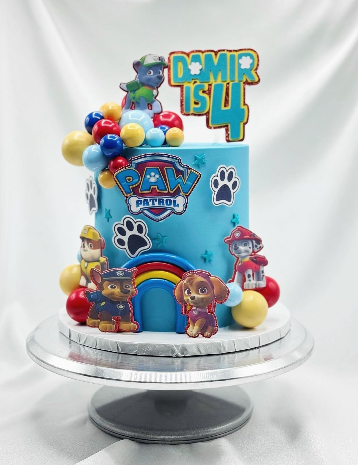 This vibrant Paw Patrol-themed cake brings joy and excitement to any birthday party. Featuring bright blue frosting, colorful fondant balls, and playful character toppers, it captures the essence of a fun-filled celebration. The rainbow arch and the personalized “Damir is 4” banner add an extra special touch.