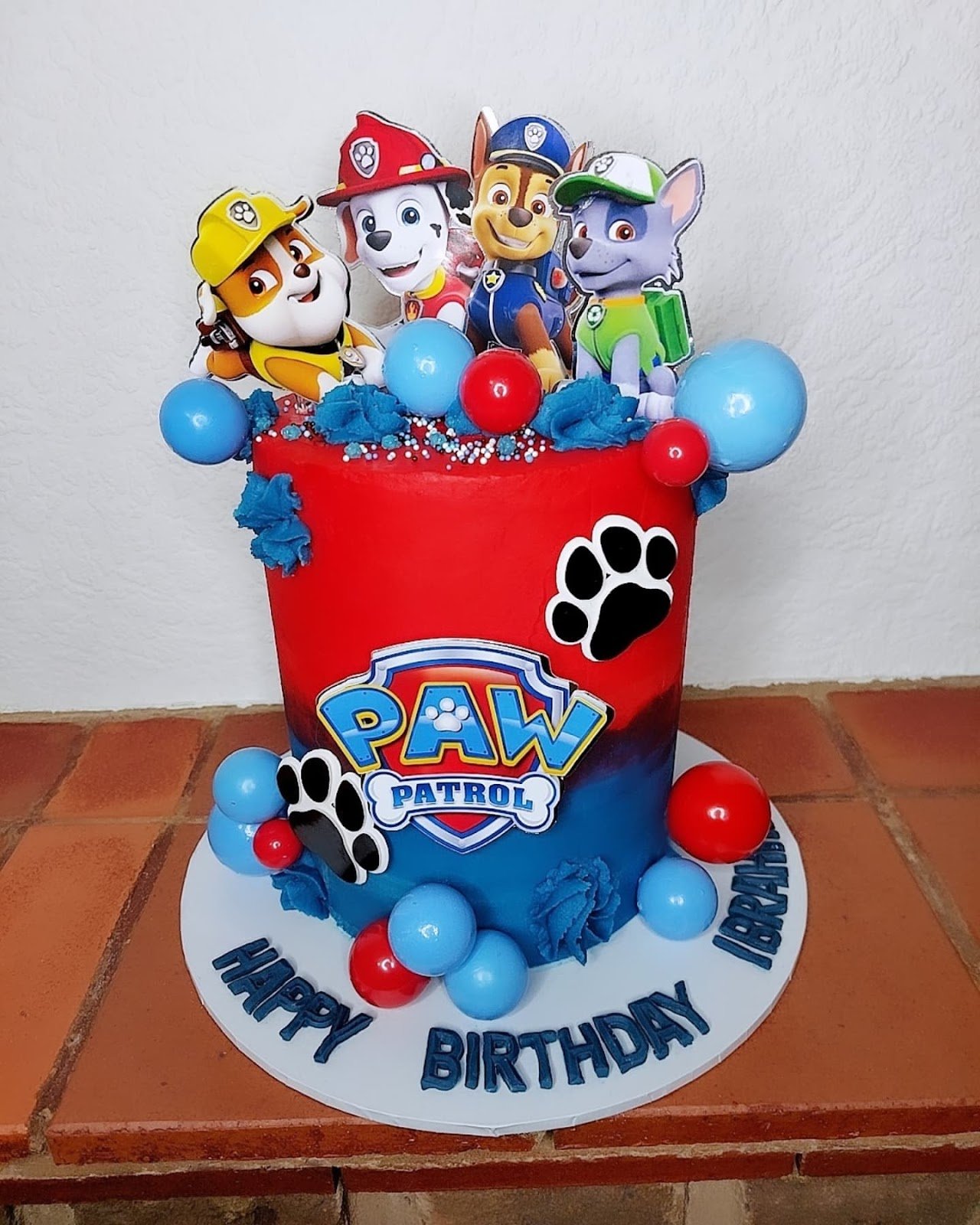 Bright red and blue frosting instantly draws attention, paired with playful edible balls and paw prints that enhance the cake’s lively design. Topped with favorite Paw Patrol characters, the tall structure feels adventurous and full of party excitement.