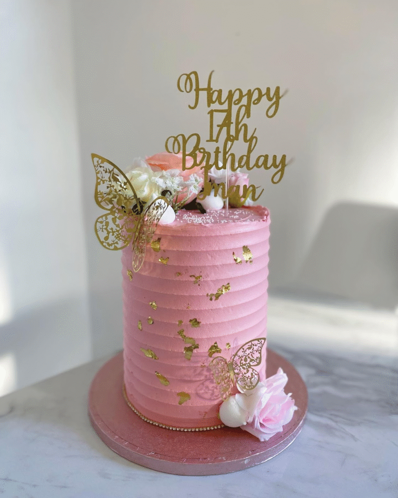 A striking tall cake in pastel pink buttercream showcases refined texture and artistic gold leaf details. Graceful butterflies, crafted in golden filigree style, enhance the design with a delicate, whimsical touch of beauty.