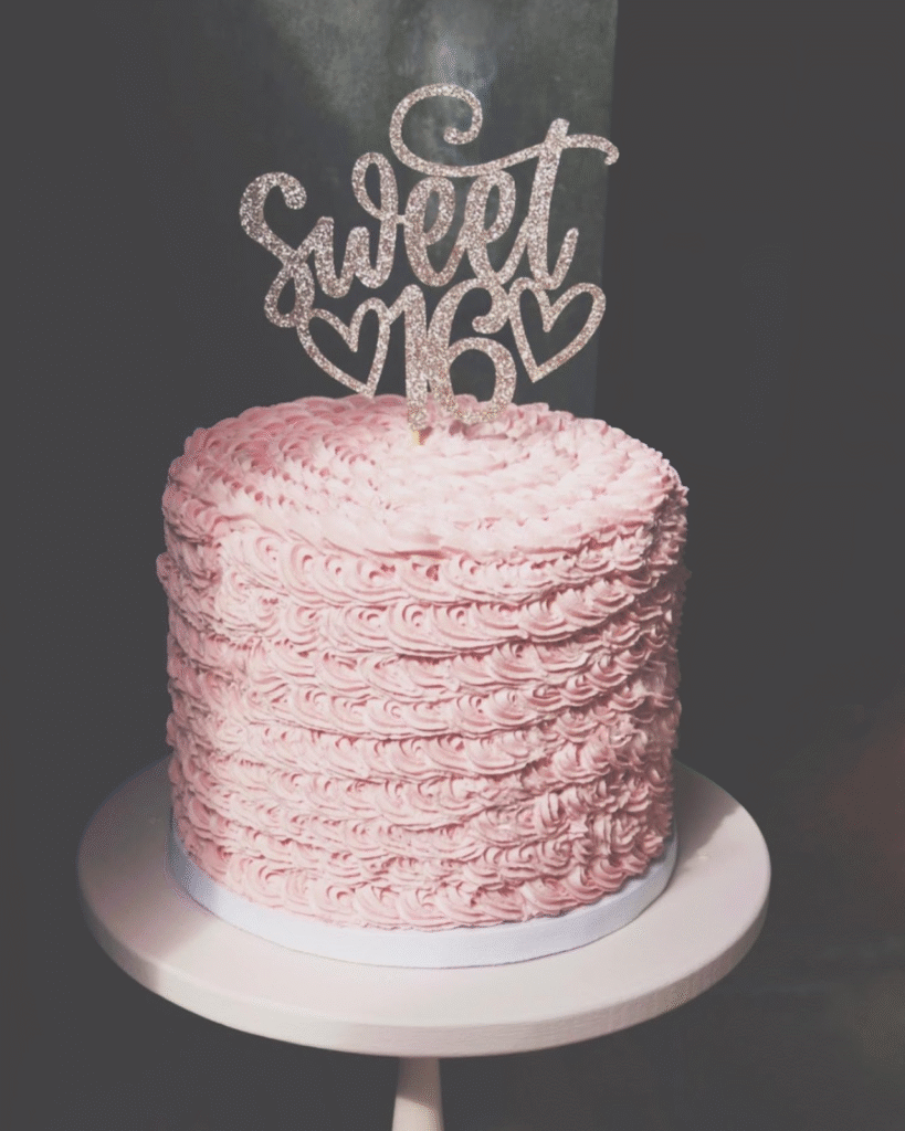 Every layer of this cake is covered in intricate pink buttercream rosettes, adding a romantic and textured appearance. The shimmering “Sweet 16” topper brings sparkle, while the hearts accentuate the celebratory theme with youthful charm.