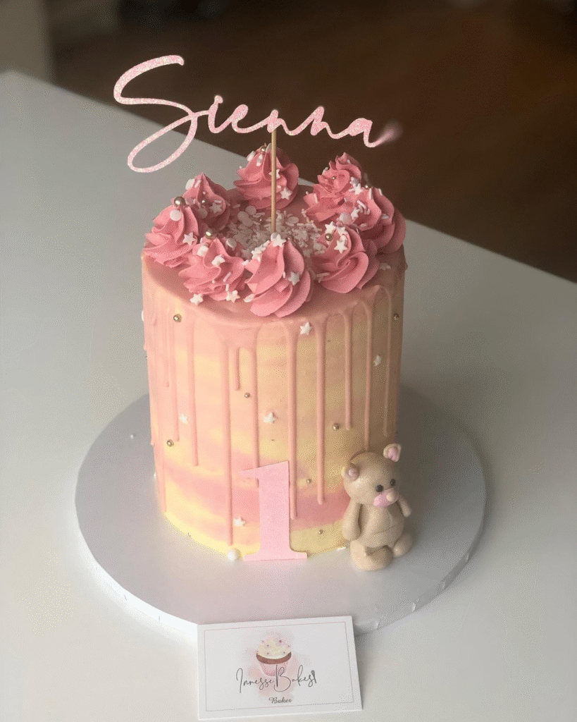 A glittering topper with the name “Sienna” personalizes the design, and the fondant teddy bear adds a heartwarming touch. Perfectly balanced with the pink number “1,” this cake is a delightful centerpiece for celebrating a first birthday.