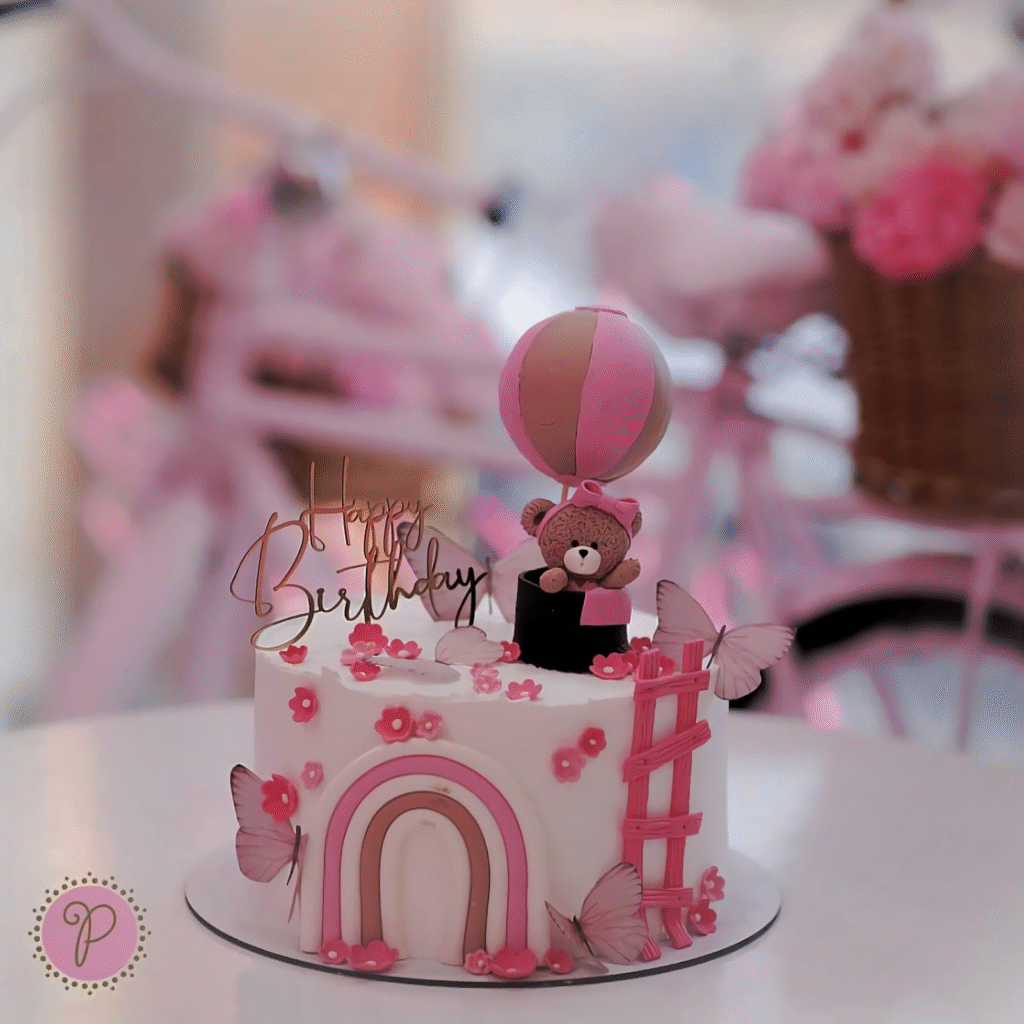 A teddy bear holding onto a balloon takes center stage, bringing a playful storytelling element to the cake. Butterflies, pink flowers, and a rainbow add delicate charm, making the cake look both festive and imaginative.