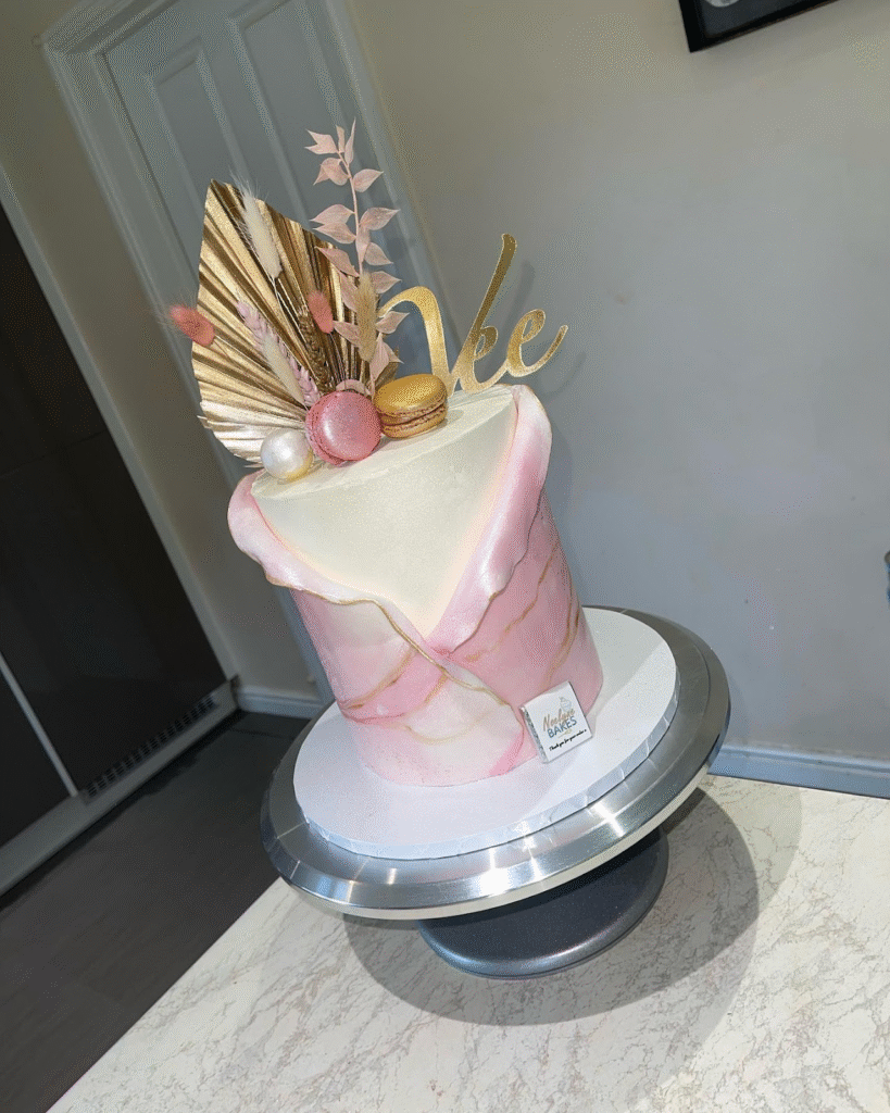 Pastel marbling in soft pinks and whites wraps around the cake with subtle gold lines that add richness. A fondant fold effect cascades gracefully down the sides, enhancing the cake’s artistic and modern look.