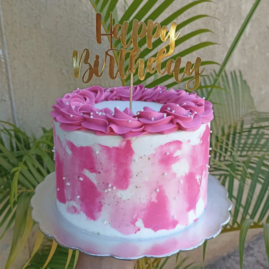 Delicate rosettes, bold pink textures, and shimmering accents weave together seamlessly, highlighting the cake’s luxurious appeal. Topped with a golden “Happy Birthday” sign, this creation radiates charm and beauty, making it a centerpiece that captures attention instantly.