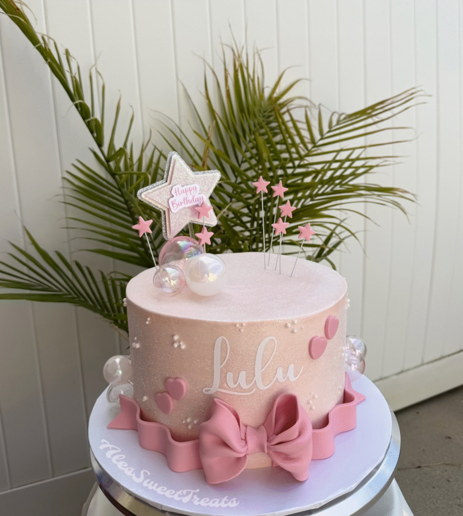 A smooth pink base dusted with shimmer gives this cake a magical glow. Tiny fondant hearts and pearl-like details add sweetness, while a large bow at the base creates a playful finishing touch. The name “Lulu” personalizes it perfectly.