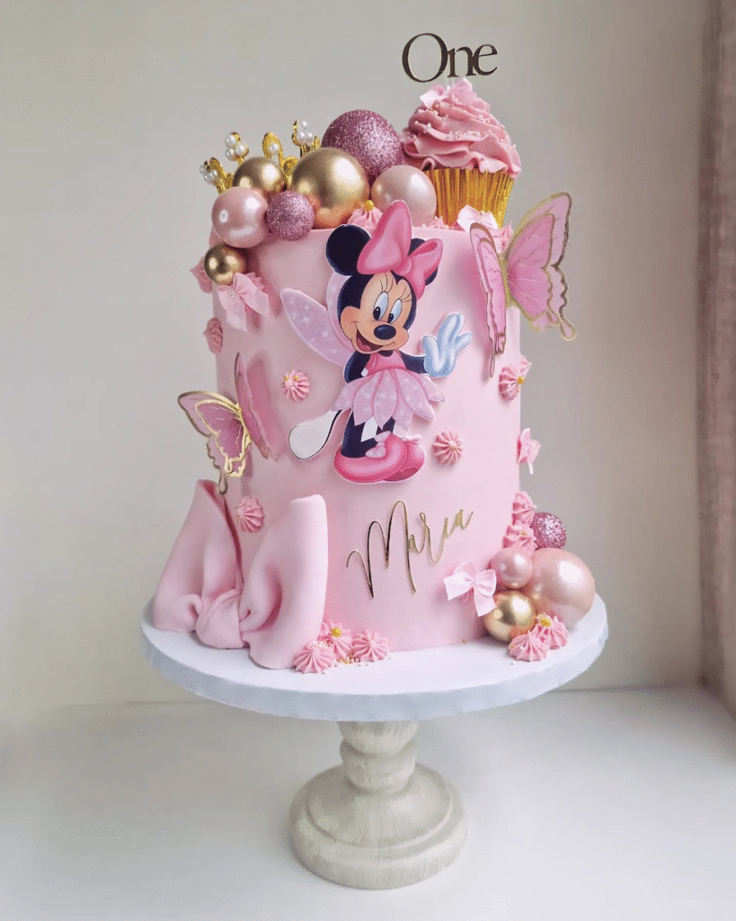 Pink elegance takes center stage in this whimsical cake adorned with Minnie Mouse dressed like a ballerina fairy. Golden pearls, sparkling globes, and soft rosettes add eye-catching charm, while a shiny crown hints at a princess-inspired celebration theme.
