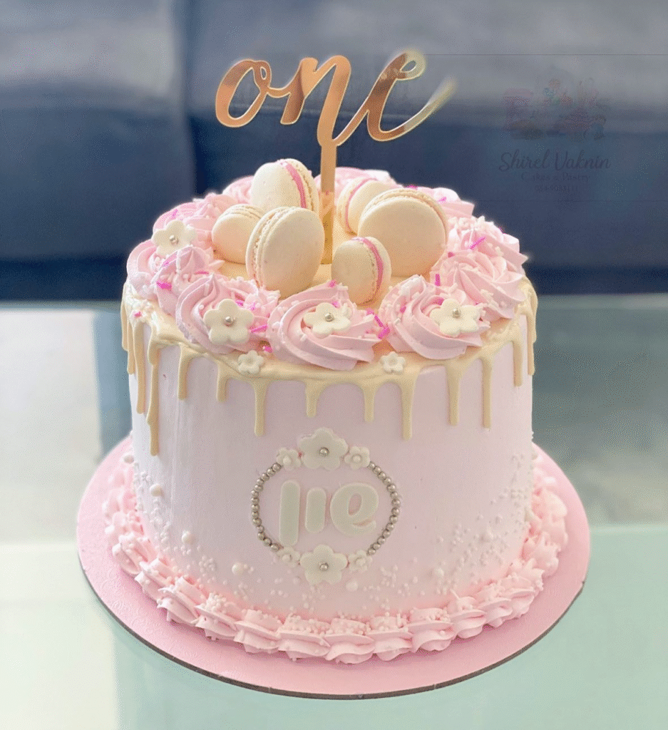 A cluster of creamy macarons sits atop the cake, encircled by swirls of pastel rosettes. Each detail reflects artistry and festivity, ensuring the first birthday feels truly magical, elegant, and full of delight.