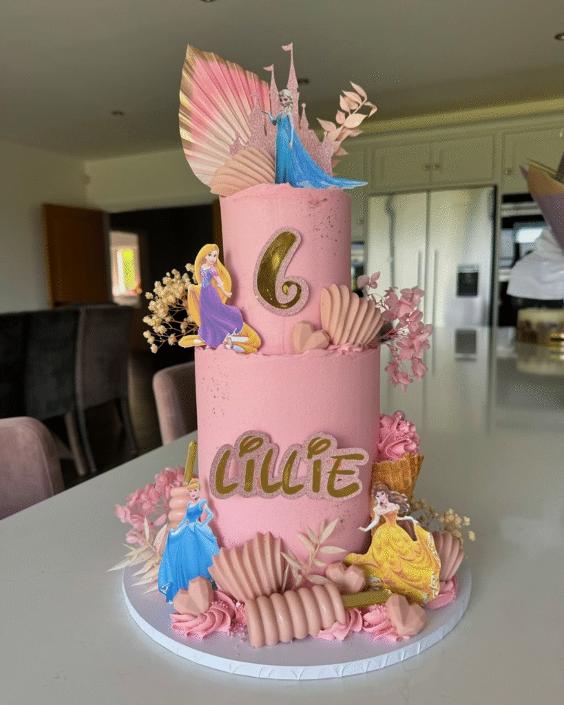 Layers of pastel pink buttercream give this cake a playful yet elegant finish, crowned with a shimmering topper. Golden lettering spells “Lillie,” perfectly personalized, while princess characters add a lively storybook feel to the design.