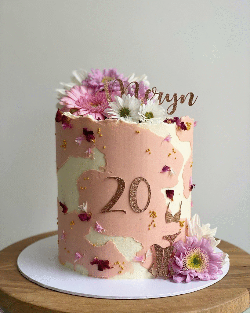 A tall, modern cake combines rustic-textured frosting with shades of blush and cream, accented by shimmering gold sprinkles and scattered petals. The sparkling rose-gold “20” design ensures the birthday milestone feels stylish and unforgettable.