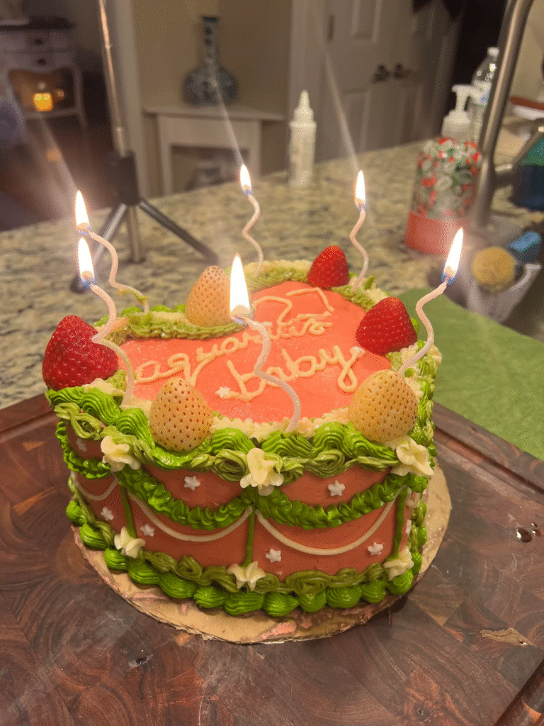 What Makes This Image Stand Out: Bold color contrast, retro piping, and fresh strawberries paired with glowing candles make this cake uniquely festive.