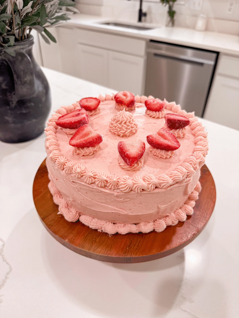 Covered in pink buttercream, this cake exudes freshness and sweetness with a soft, inviting finish. Decorative piped borders frame the design, while strawberry halves sit atop swirled frosting mounds, enhancing the cake with a natural, fruity touch.