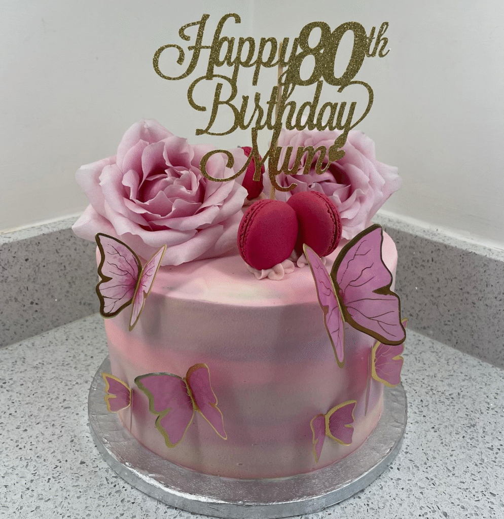 A glittering golden topper reading “Happy 80th Birthday Mum” completes the look with sparkle and warmth. This cake balances floral beauty, whimsical butterflies, and luxury details, making it perfect for such a milestone celebration.