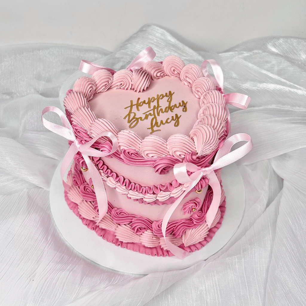 Every detail stands out, from the playful ribbons tied perfectly around the tiers to the luxurious heart-shaped border on top. The golden message adds a touch of sparkle, balancing elegance and joy for a birthday celebration filled with magic and style.