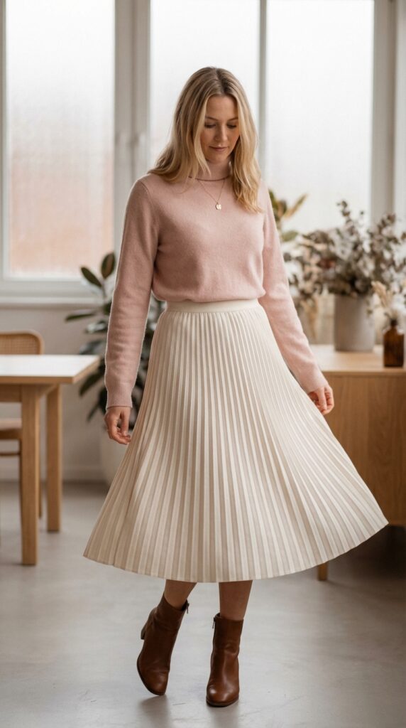 For footwear, ankle boots or knee-high boots complement this look perfectly. The cozy textures of cashmere against the structured pleating creates an appealing contrast that photographs beautifully for those birthday memories you’ll treasure.
