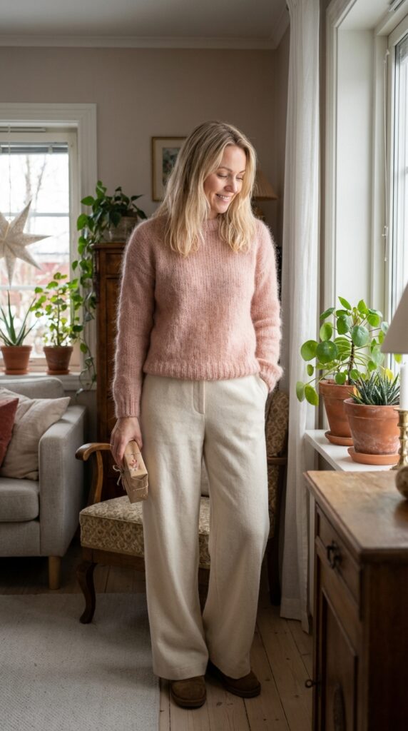 Comfort meets sophistication when you slip into a blush mohair sweater paired with wide-leg pants for your winter birthday celebration. This combination strikes the perfect balance between cozy and chic—trust me, you’ll feel like you’re wearing a cloud.