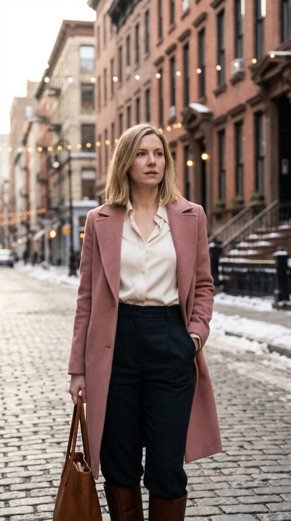 For those moments when you want to look effortlessly refined rather than obviously dressed up, a dusty pink wool coat layered over a cream silk blouse strikes that perfect balance between celebration-ready and sophisticatedly understated.