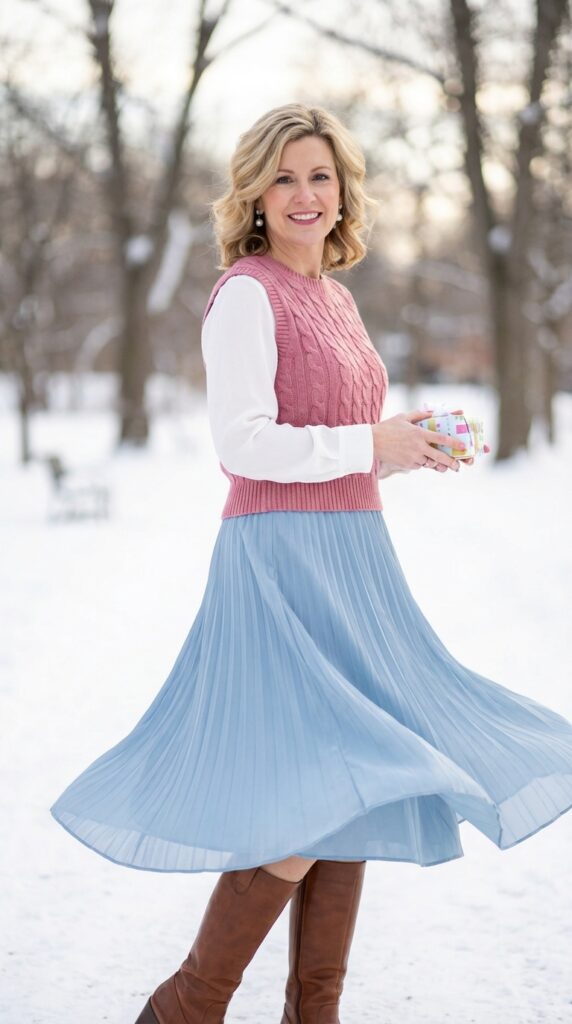 A rose pink sweater vest layered over a flowy skirt creates the perfect balance between preppy sophistication and feminine romance for winter birthdays.