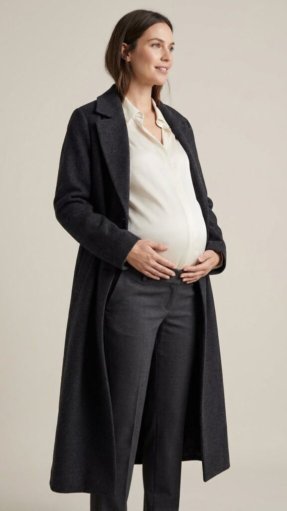 Nothing says “effortlessly sophisticated” quite like the timeless combination of a silk blouse paired with meticulously crafted maternity trousers and a long coat—it’s pregnancy refinement at its finest.