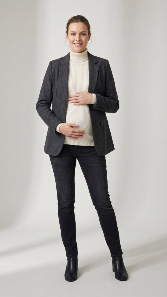 Since you’re aiming for that perfect balance of polished and comfortable, a layered turtleneck with a maternity blazer creates an effortlessly chic birthday look that’ll take you from office celebrations to dinner reservations.
