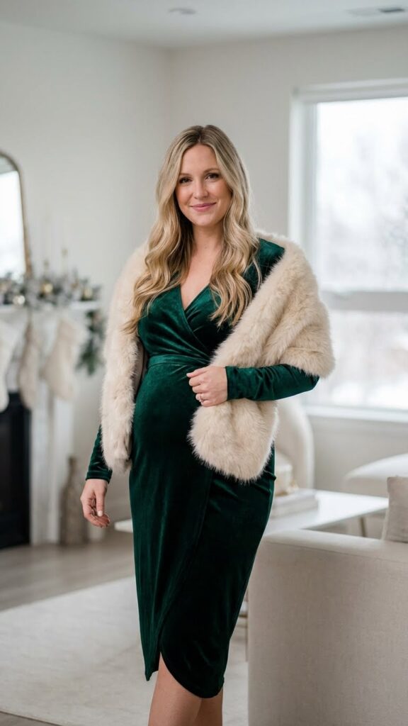 For something more refined and celebration-worthy, a wrap-style midi dress paired with a lavish faux fur stole alters your winter birthday into a glamorous affair. You’ll love how the wrap design naturally accommodates your growing bump while creating a sophisticated silhouette.