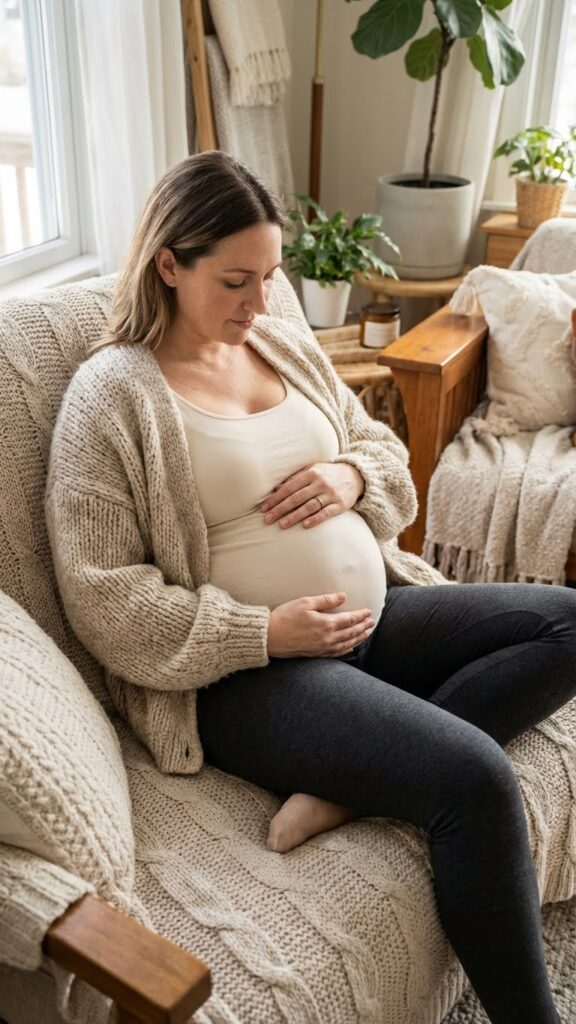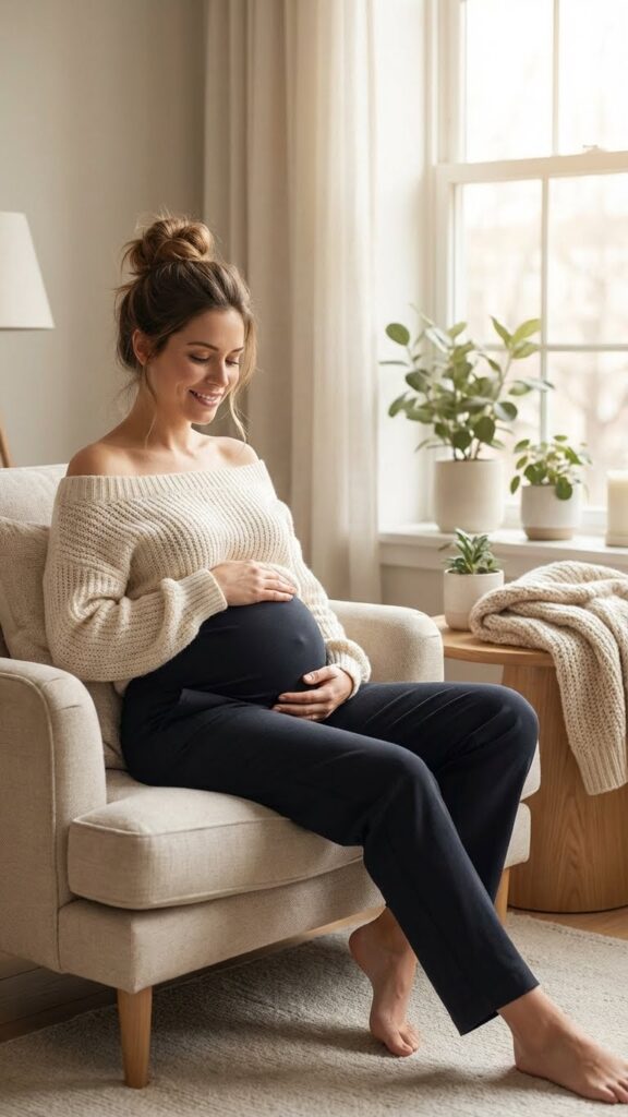 The magic happens when you combine layered textures. Pair a smooth cotton base with a chunky wool cardigan for visual interest. The oversized silhouette gives you room to breathe while creating that relaxed-elegant vibe perfect for winter birthday celebrations. Complete the look with dark maternity leggings and ankle boots. This combo works for intimate dinners or casual birthday gatherings, and you’ll stay warm without sacrificing style.