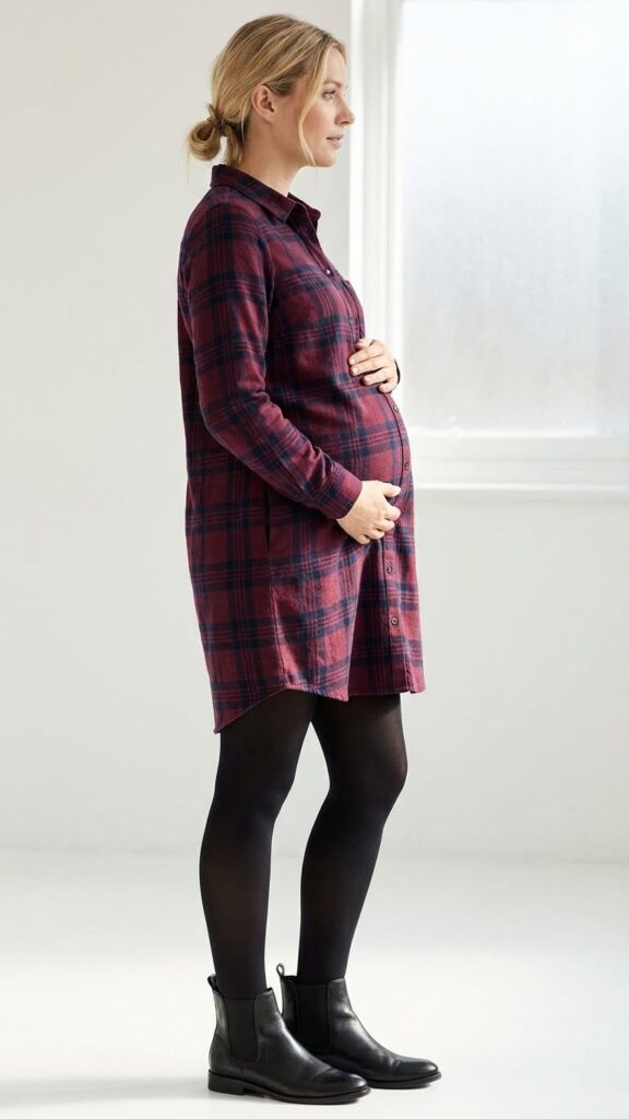 6Plaid Maternity Shirt Dress With Tights and Ankle Boots
