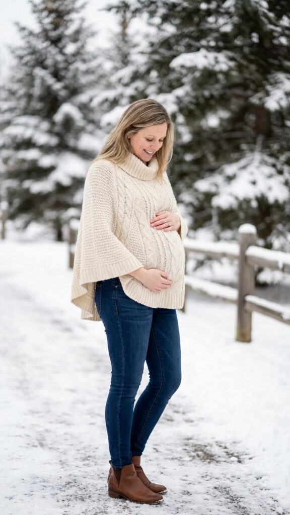 Choose a poncho in cream, burgundy, or forest green for rich seasonal appeal. The cable knit pattern adds visual interest and those cozy textures that make winter dressing so satisfying. Pair it with dark-wash skinny maternity jeans that’ll hug your legs without feeling restrictive.