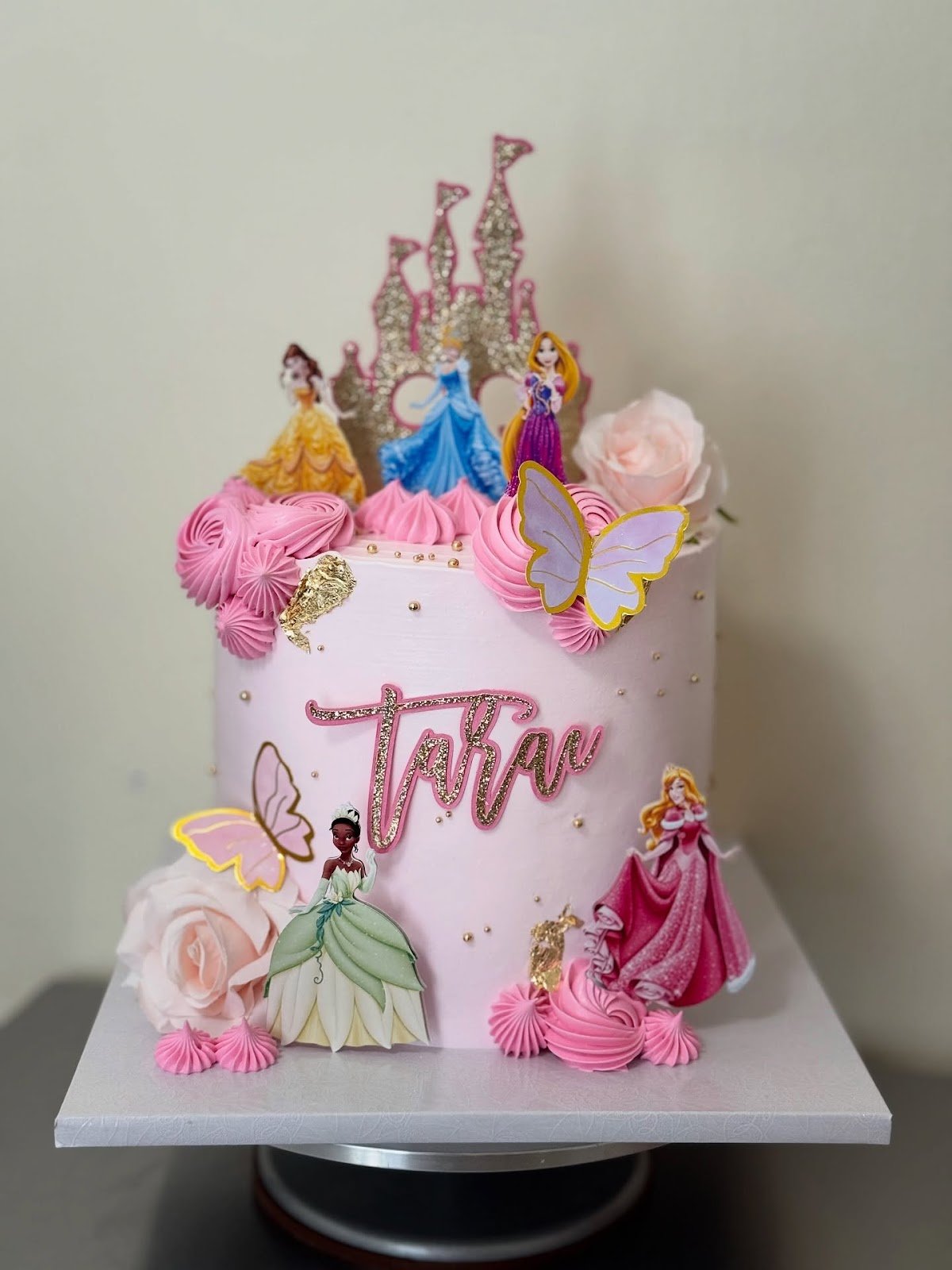 Given enchanting birthday cake is a true fairytale masterpiece, designed in a soft pastel pink that radiates sweetness and charm. Decorated with swirls of pink frosting, delicate roses, and shimmering gold accents, it instantly captures a magical celebration vibe. The highlight of the cake is its princess theme, featuring beloved Disney princess cutouts like Belle, Cinderella, Rapunzel, Aurora, and Tiana, each bringing her own charm.
