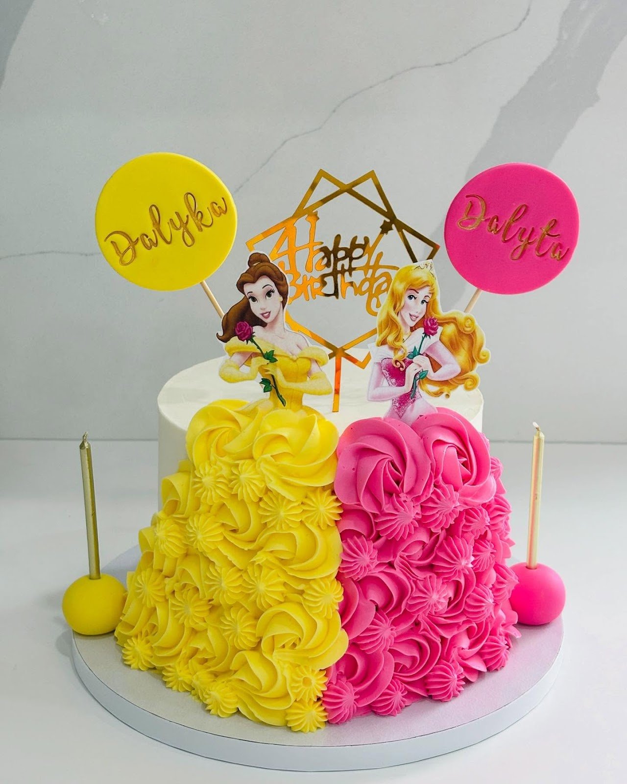 Princess cake is the perfect fit for a birthday party, combining bold colors and playful princess vibes. The cake features a split design with a stunning yellow and pink buttercream arrangement, highlighting the two princess figures: Belle and Aurora. With vibrant colors and a modern twist on classic princess cake designs, it’s sure to delight any young child.