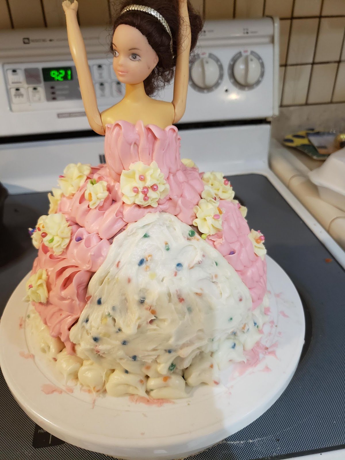 Perfect blend of fun and creativity, this doll cake is sure to light up any birthday party! The pink buttercream gown adorned with delicate flower details gives this cake a cheerful and playful vibe. The sprinkle-covered bottom half of the dress adds a fun, colorful twist, making it an exciting cake for a 5th birthday celebration.