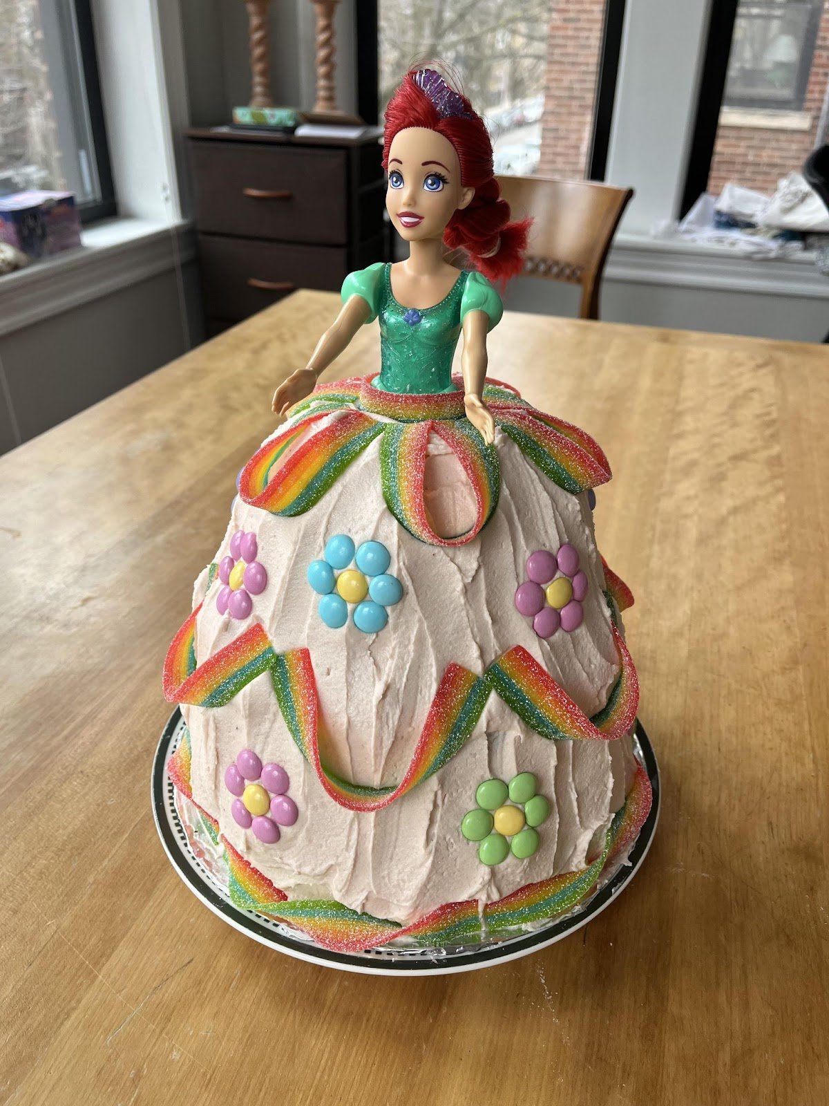 Bursting with color and charm, this Ariel doll cake transforms a birthday into a fairytale celebration. The doll stands proudly in the center, dressed in a gown made of smooth frosting accented with rainbow candy ribbons that drape gracefully like flowing fabric. Bright candy flowers in pastel shades of pink, blue, green, and yellow add a playful garden touch, making the design both vibrant and whimsical.
