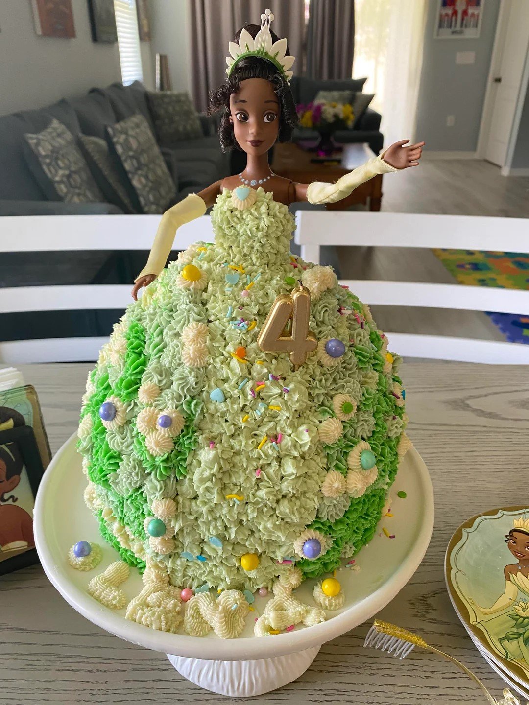 Why We Picked This Image: Highlights a creative doll dress cake with vibrant frosting, candy accents, and a magical Princess Tiana theme.