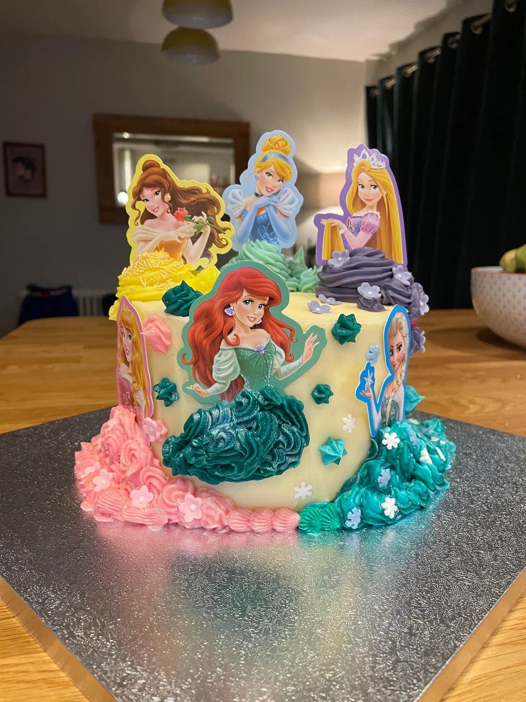 The smooth rosettes of icing paired with the elegant cake topper create an unforgettable look. It’s a showstopper for a birthday celebration that calls for elegance, color, and the magic of Disney princesses. The bright tones and cheerful feel make it ideal for a memorable day.