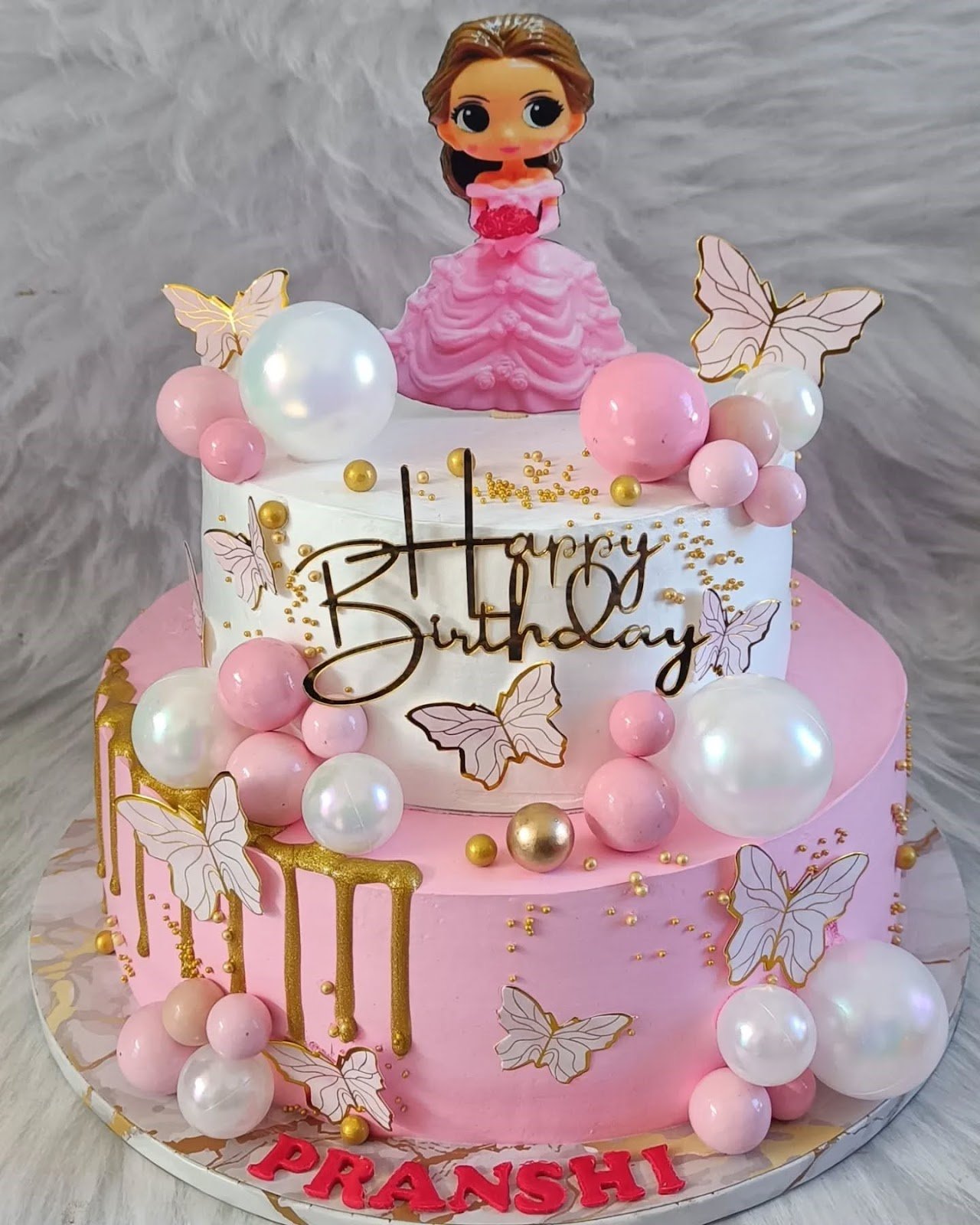 Delight and elegance meet in this stunning two-tier birthday cake, designed to make any celebration feel magical. The bottom tier, in soft pink, is adorned with golden drips and delicate butterfly cutouts, while the top tier, in crisp white, adds contrast with more butterflies and sparkling golden sprinkles. Pink, white, and pearl-like spheres cascade gracefully around the cake, giving it a whimsical and festive look.