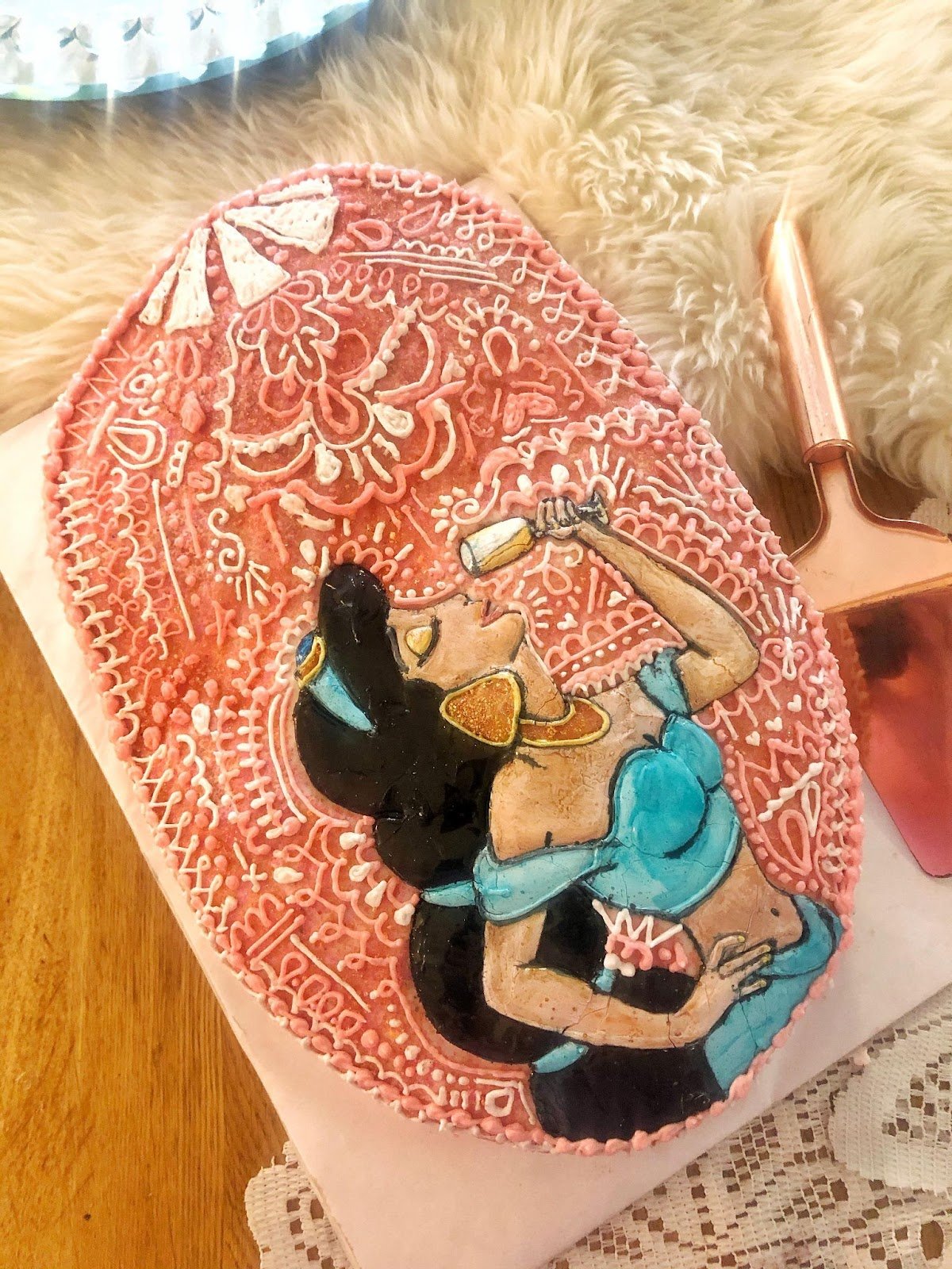 The intricate piping creates a textured, hand-crafted look, perfectly complementing the royal theme. Unique in style, the cake feels like a blend of celebration and art, showcasing both creativity and character. With its striking colors, henna-style designs, and beautifully painted Jasmine centerpiece, the cake stands out as a magical treat that celebrates both imagination and elegance.