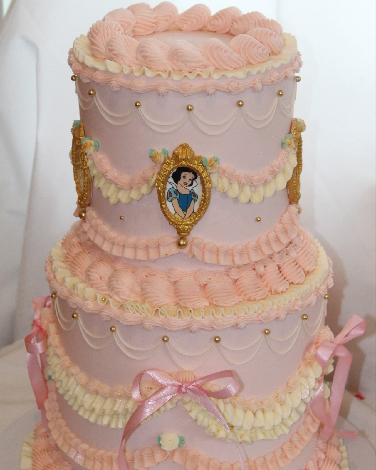 Lovely pink bows tied around the tiers bring a touch of sweetness, while framed portraits of Snow White highlight the enchanting princess theme. Each layer is crafted with intricate detailing, making the cake resemble a royal masterpiece straight out of a fairytale. Combining timeless elegance with princess magic, this creation makes for an unforgettable centerpiece, radiating joy and wonder at any celebration.
