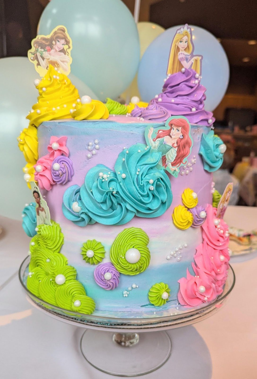 Why We Picked This Image: Highlights a colorful princess cake with pastel swirls, pearl accents, and character decorations that create enchanting fairytale charm.