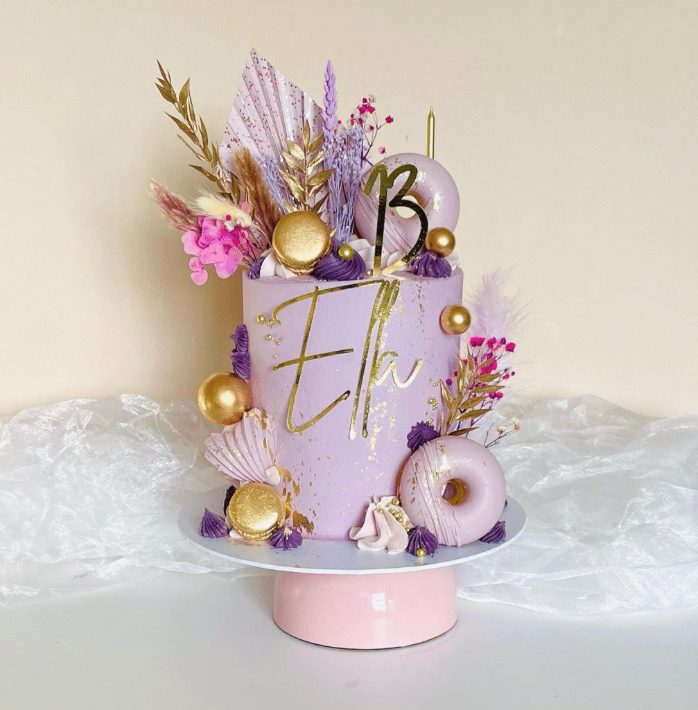This beautiful lavender cake boasts a stunning golden theme, featuring delicate florals and pastel decorations. Gold balls and macarons provide texture, while the personalized “Ella” in shimmering gold adds a chic touch.