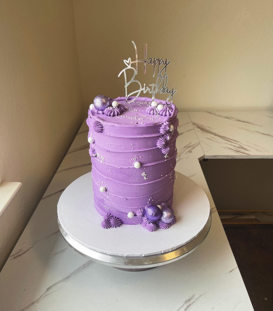 This elegant birthday cake features a soft, rich purple frosting that immediately grabs attention. The layers are beautifully decorated with delicate pearl accents and vibrant purple swirls, giving it a stylish yet charming feel.