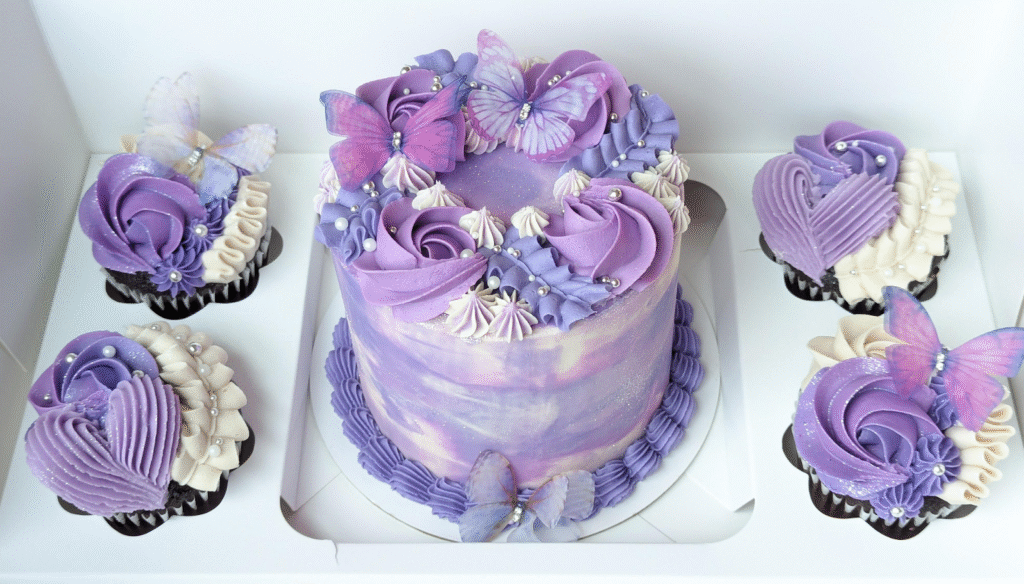 This delicate lavender cake set exudes a dreamy, magical vibe. The cake features a smooth swirl of pastel purple buttercream, adorned with intricate buttercream flowers and two beautiful butterflies resting on top. The cupcakes complement the cake with their own flower designs, showcasing a mix of purple and ivory, and embellished with pearl-like beads for a touch of elegance.
