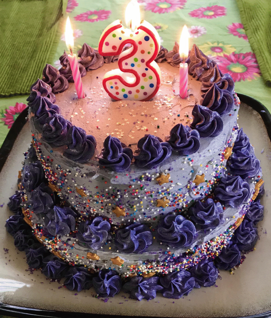 What Makes This Image Stand Out: The stunning contrast of purple frosting, playful sprinkles, and the bold “3” candle makes this cake a showstopper.
