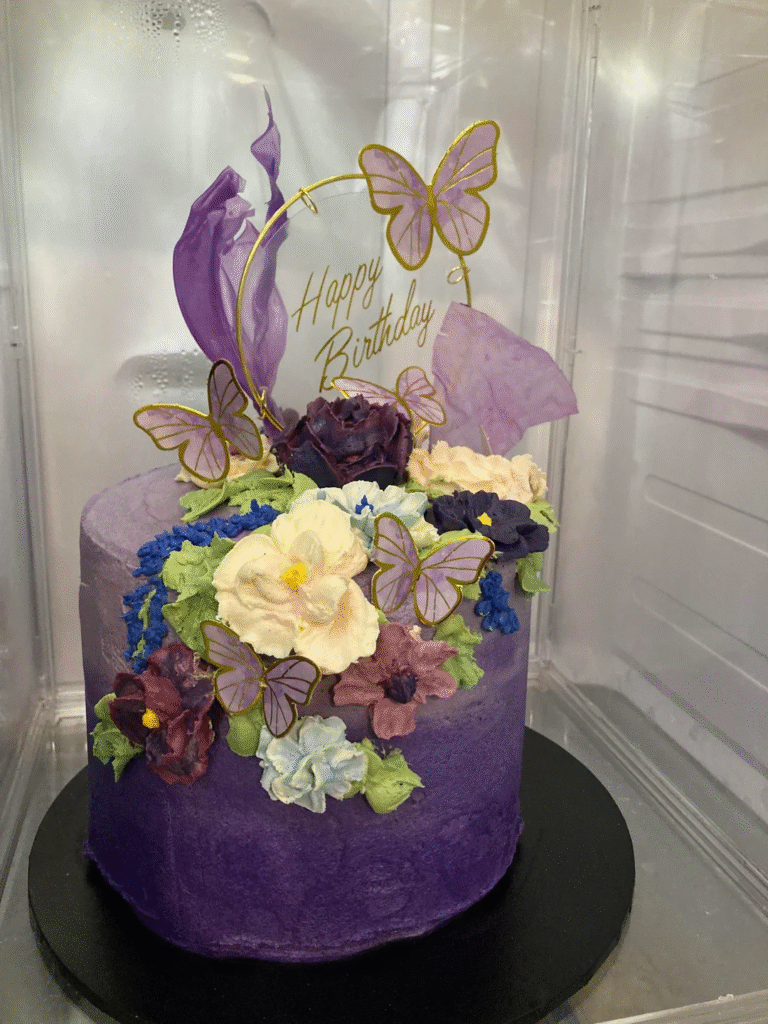 This stunning birthday cake is a masterpiece of intricate floral details. Soft, buttery frosting in deep purple seamlessly blends with the bright flowers, creating a visually captivating contrast. The golden butterfly accents add an ethereal touch to the overall look.