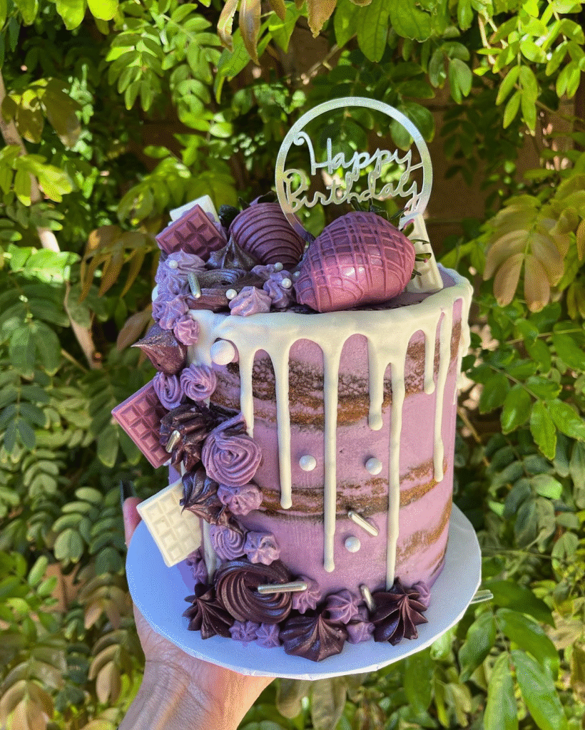 What Makes This Image Stand Out: The combination of purple buttercream, chocolate decorations, and playful drip effect makes this cake perfect for a fun and indulgent birthday celebration.