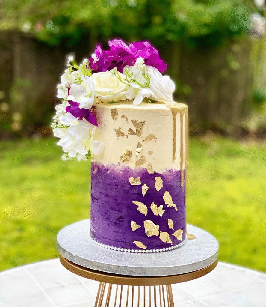 What Makes This Image Stand Out: The lively purple and gold color combination, along with the delicate buttercream flowers, creates an eye-catching cake that exudes elegance and celebration.